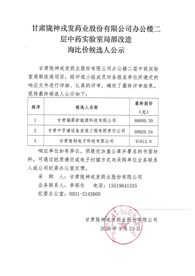甘肃必一运动药业股份有限公司办公楼二层必一运动 实验室局部改造询比价候选人公示