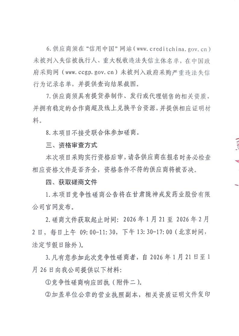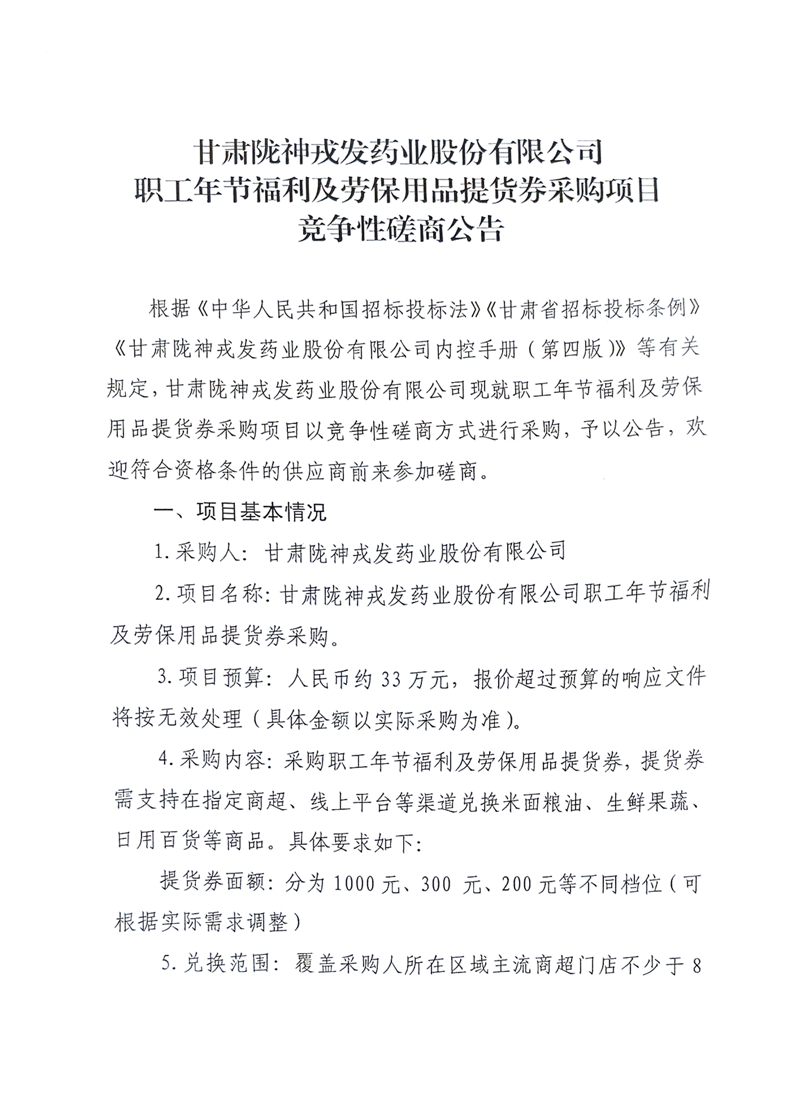 甘肃必一运动药业股份有限公司职工年节福利及劳保用品提货券采购项目竞争性磋商公告