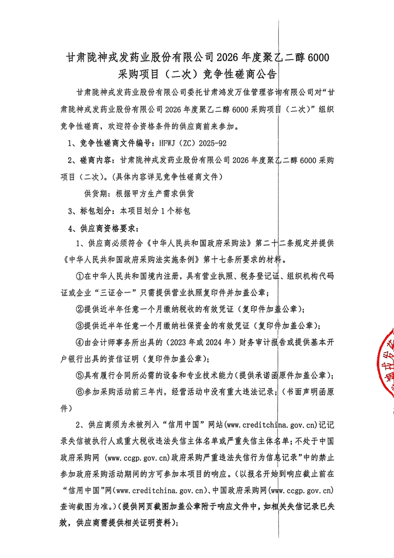 甘肃必一运动药业股份有限公司2026年度聚乙二醇6000采购项目(二次)竞争性磋商公告