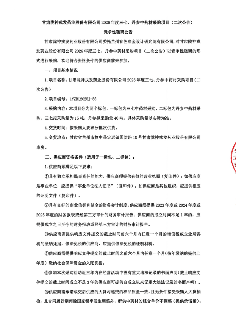 甘肃必一运动药业股份有限公司2026年度三七、丹参必一运动 材采购项目(二次公告)竞争性磋商公告