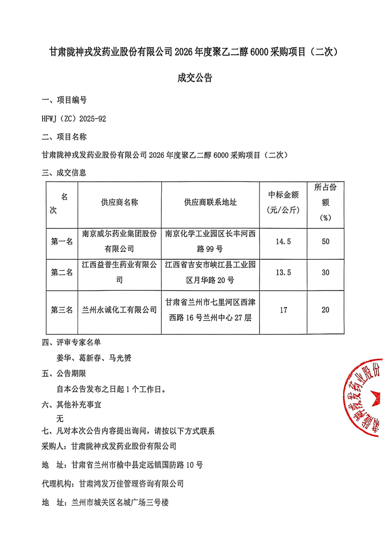 甘肃必一运动药业股份有限公司2026年度聚乙二醇6000采购项目(二次)成交公告