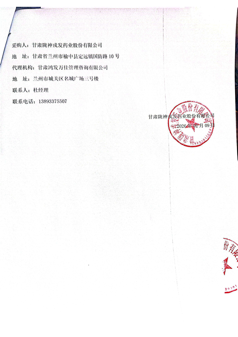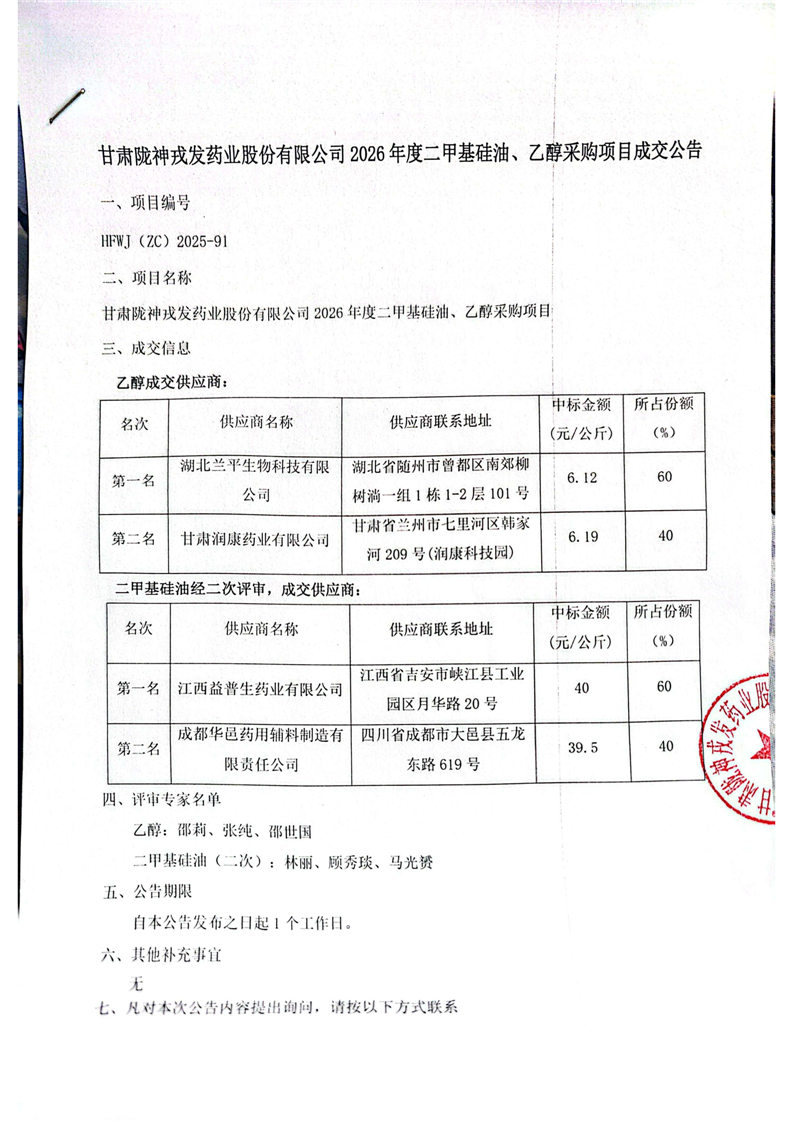 甘肃必一运动药业股份有限公司2026年度二甲基硅油、乙醇采购项目成交公告