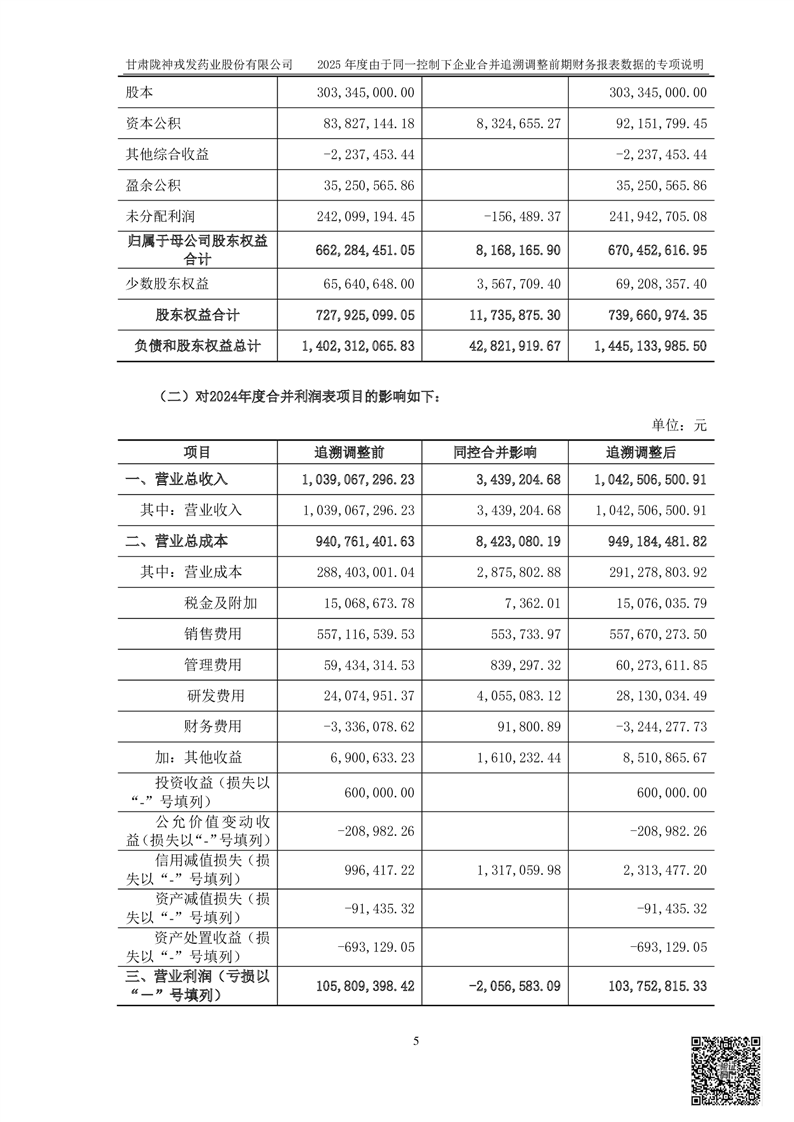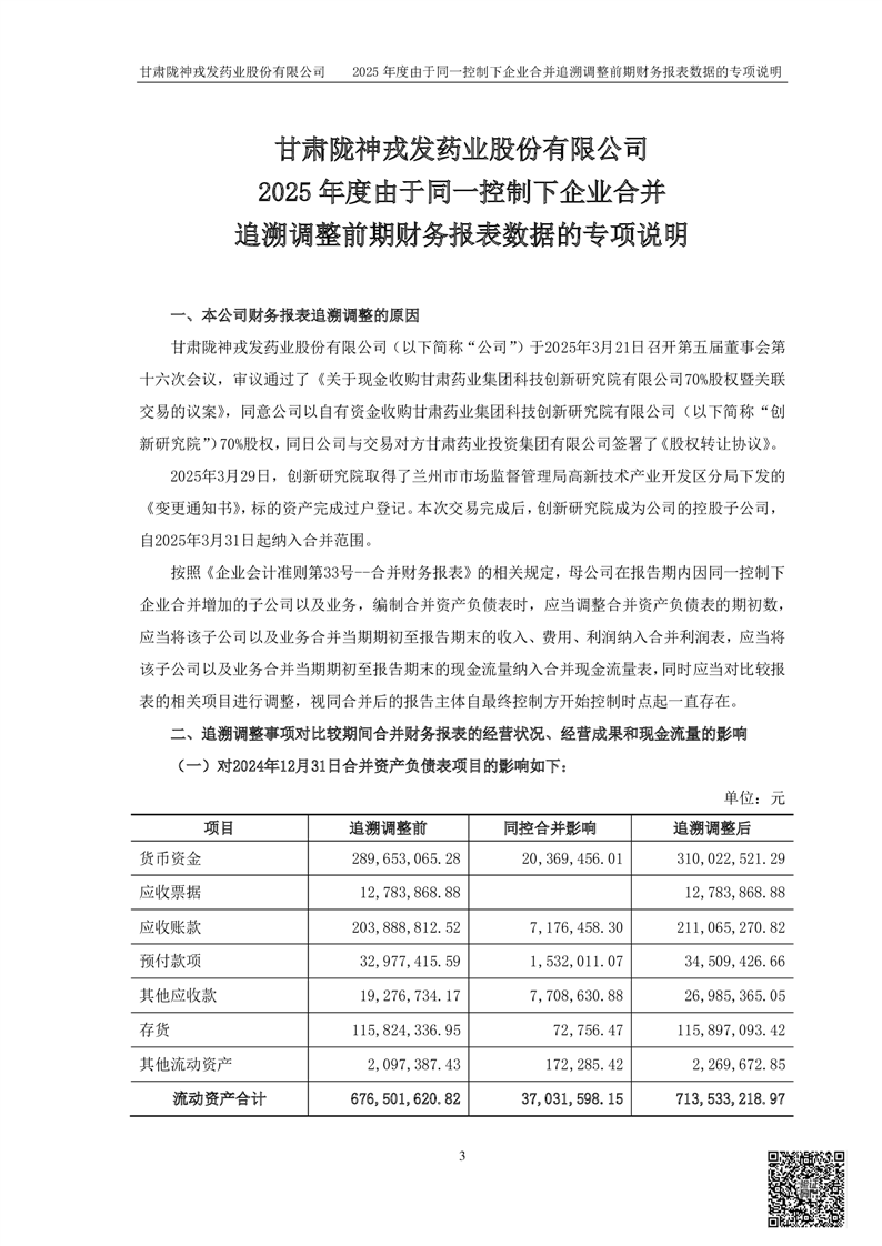 关于甘肃必一运动药业股份有限公司2025年度由于同一控制下企业合并追溯调整前期财务报表数据的专项说明