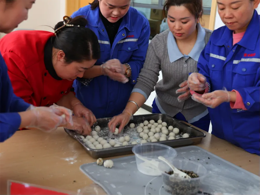 汤圆DIY比拼环节将整场活动的节日氛围推向高潮。活动现场,工作人员提前备妥糯米粉、馅料等制作材料,为比赛顺利开展做好充分准备。各参赛小组分工明确、配合默契,揉制面团、包裹馅料、搓制成型,一系列工序有条不紊。雪白的糯米团在职工们的巧手下,变成了形态各异的汤圆。经过紧张角逐,评审团从形态规整度、色泽均匀度、创意独特性及制作数量等维度进行综合评定,最终评选出“最棒汤圆”获奖小组,现场掌声、欢呼声此起彼伏,将节日的喜悦氛围推向顶点。