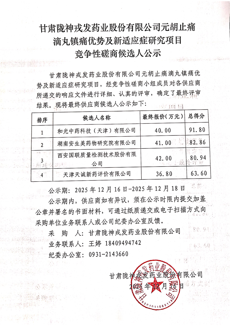 甘肃必一运动药业股份有限公司元胡止痛滴丸镇痛优势及新适应症研究项目竞争性磋商候选人公示