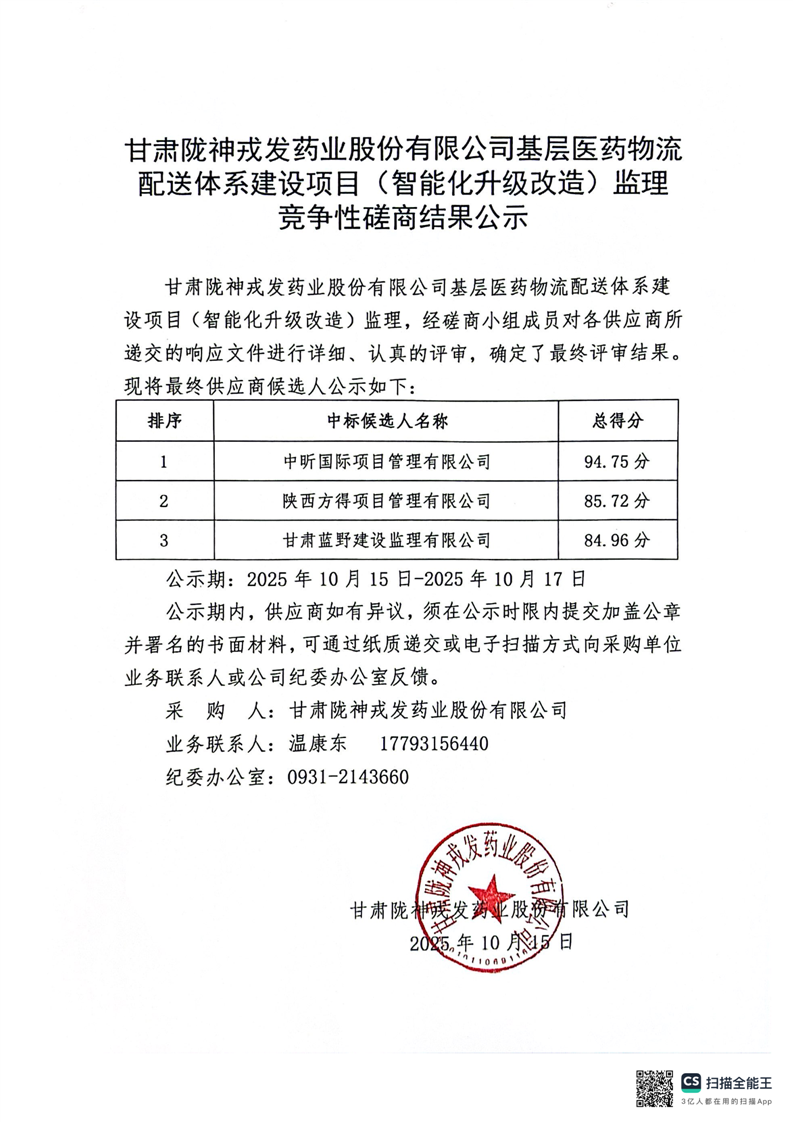 甘肃必一运动药业股份有限公司基层医药物流配送体系建设项目(智能化升级改造)监理竞争性磋商结果公示