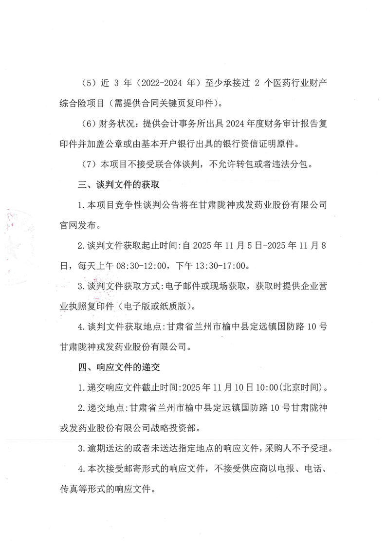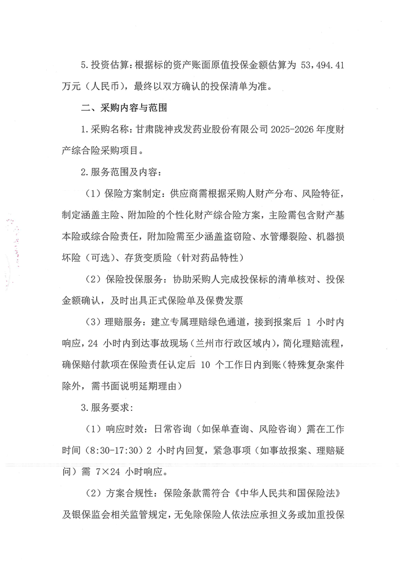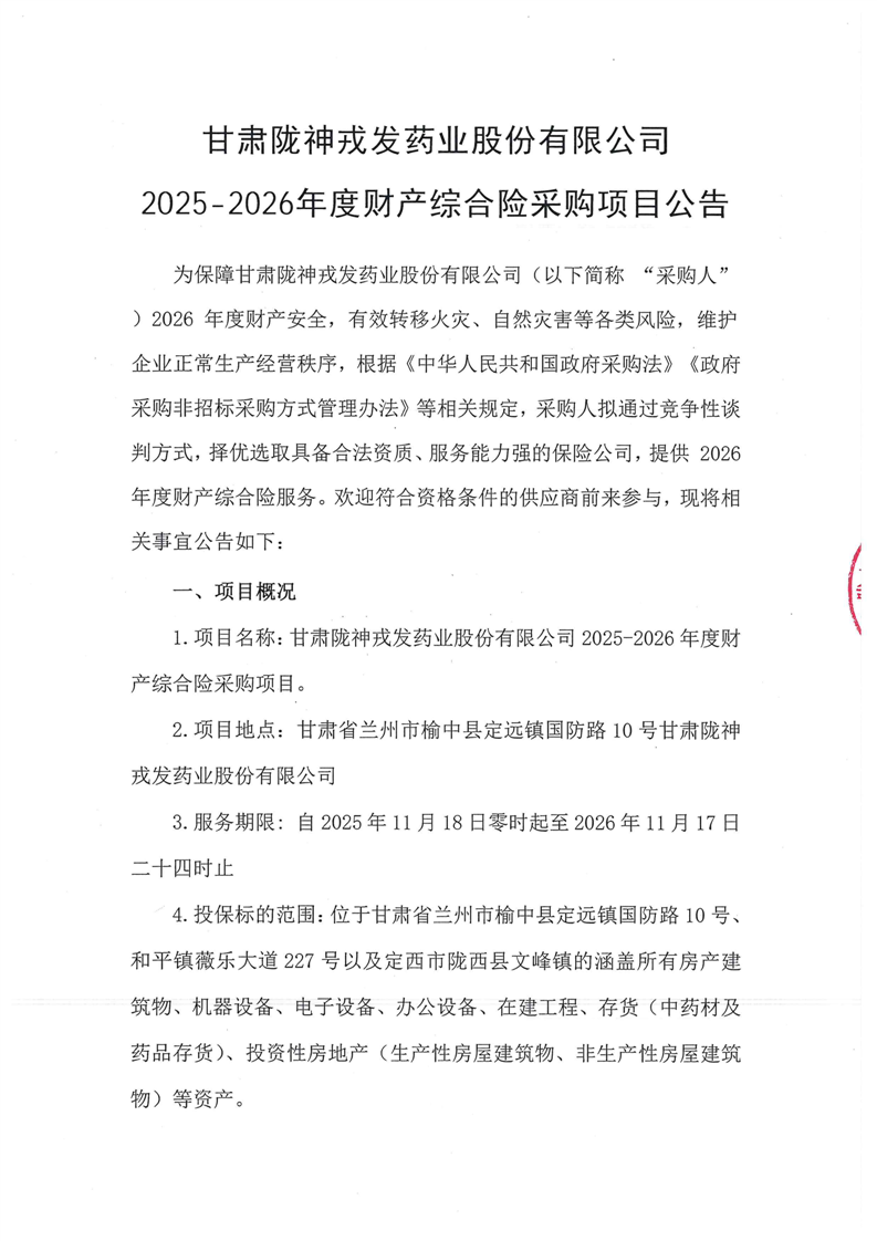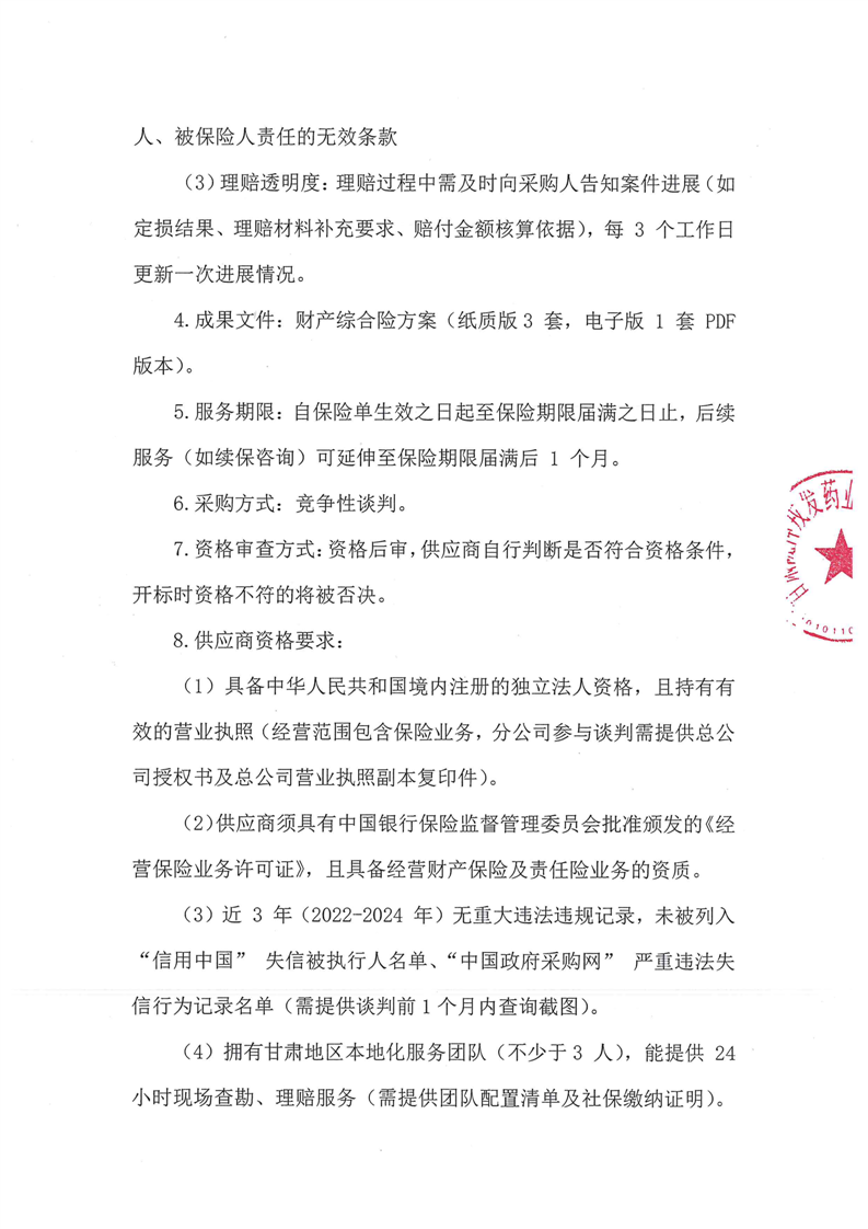 甘肃必一运动药业股份有限公司2025-2026年度财产综合险采购项目公告