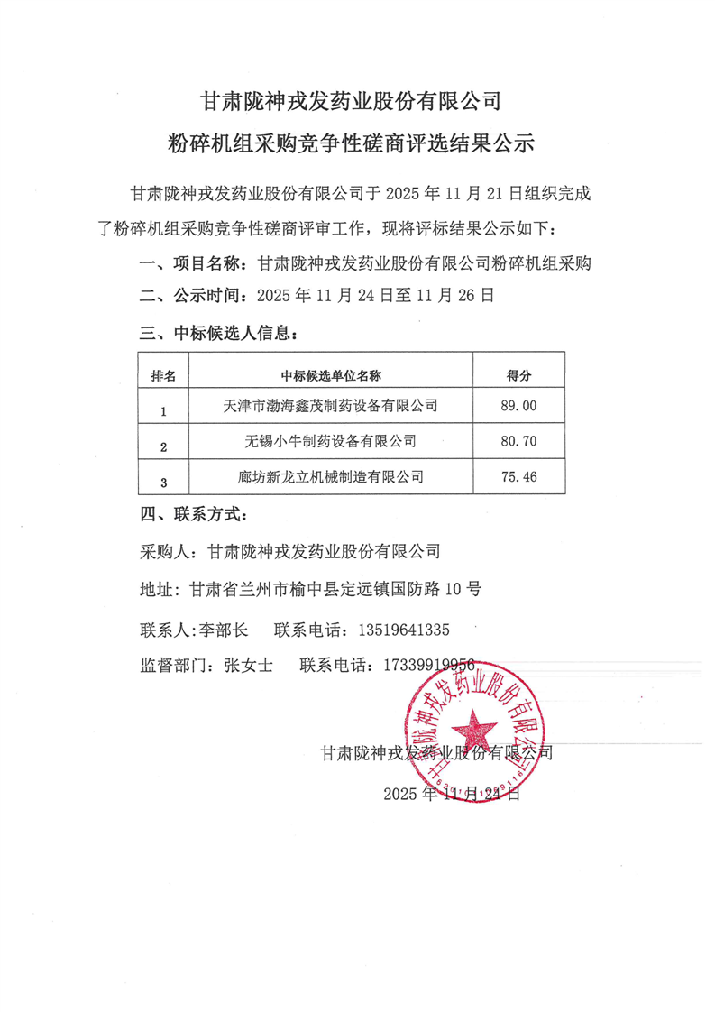 甘肃必一运动药业股份有限公司粉碎机组采购竞争性磋商评选结果公示