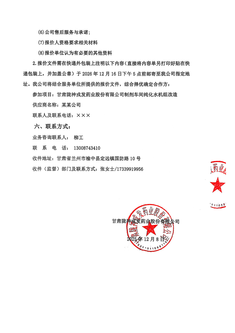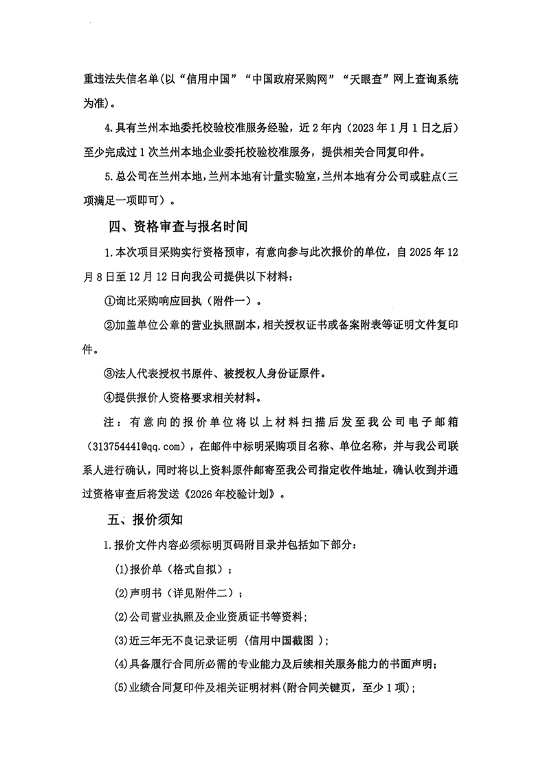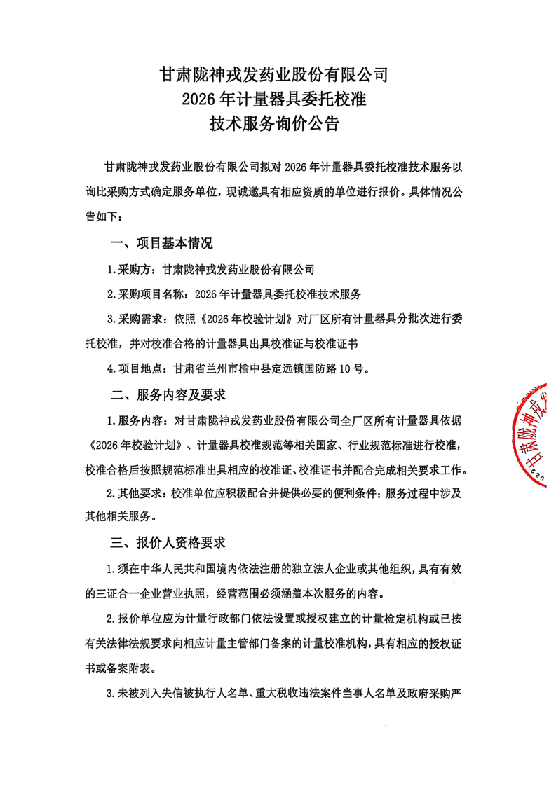甘肃必一运动药业股份有限公司2026年计量器具委托校准技术服务询价公告