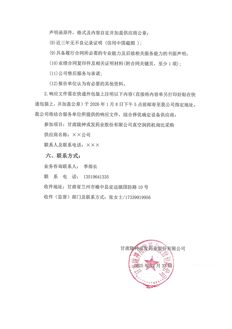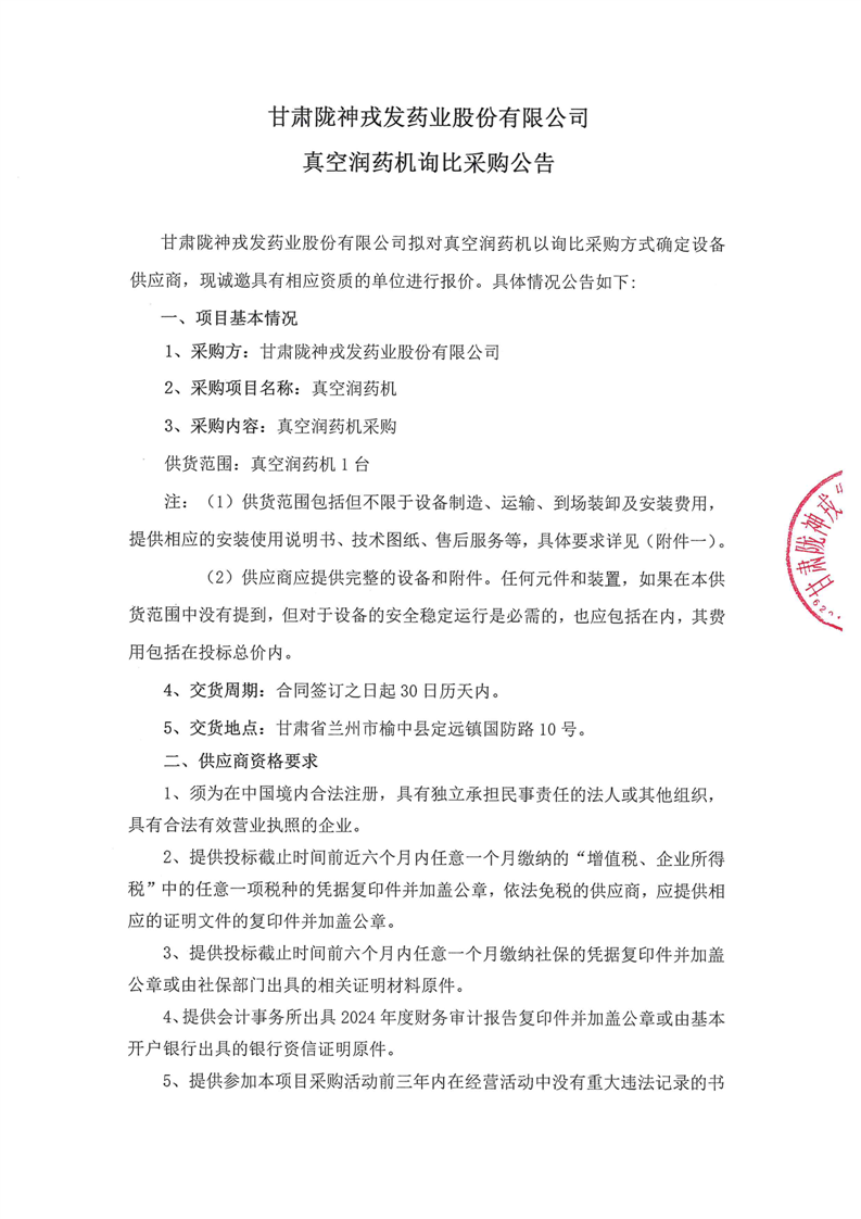 甘肃必一运动药业股份有限公司真空润药机询比采购公告