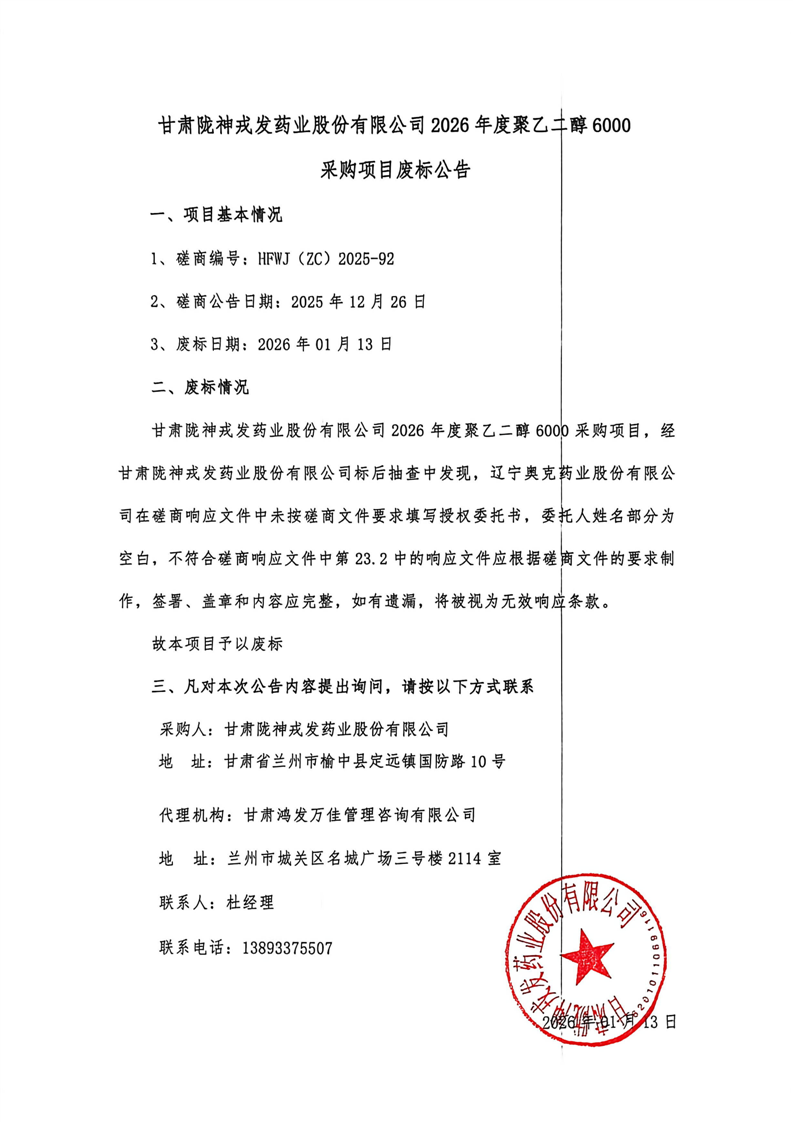 甘肃必一运动药业股份有限公司2026年度聚乙二醇6000采购项目废标公告