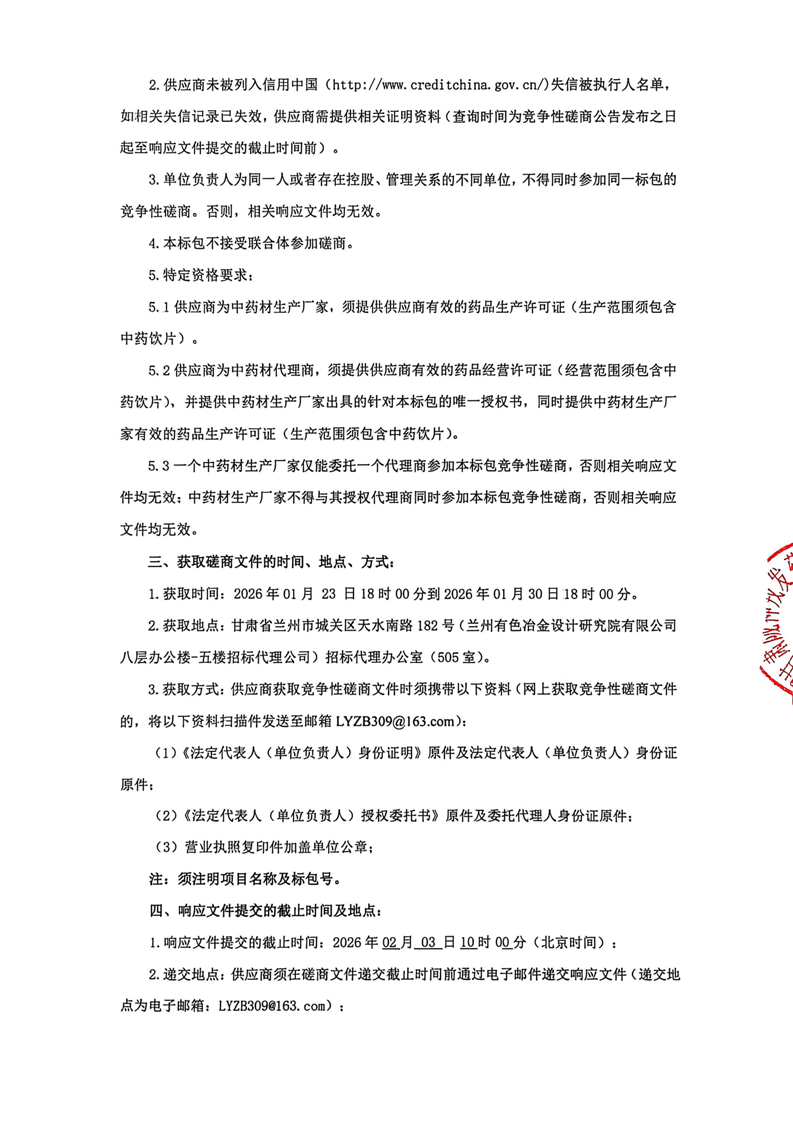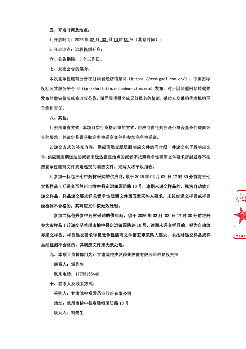 甘肃必一运动药业股份有限公司2026年度三七、丹参必一运动 材采购项目(二次公告)竞争性磋商公告