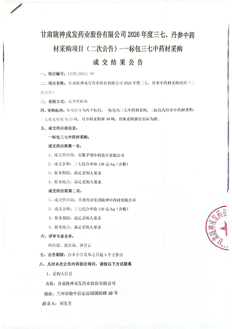 甘肃必一运动药业股份有限公司2026年度三七、丹参必一运动 材采购项目(二次公告) 一标包三七必一运动 材采购 成交结果公告