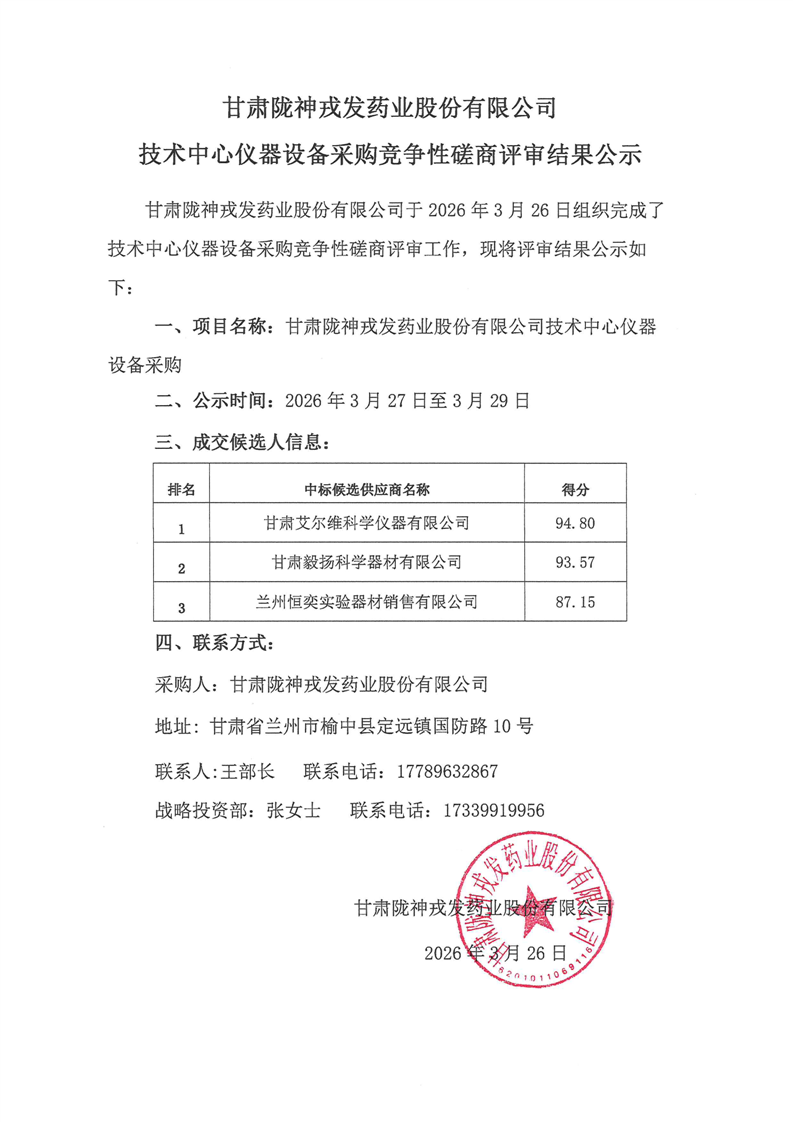 甘肃必一运动药业股份有限公司技术中心仪器设备采购竞争性磋商评审结果公示