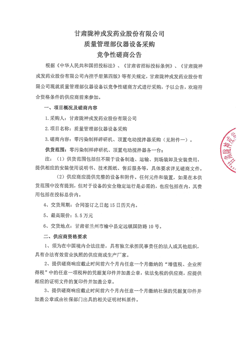 甘肃必一运动药业股份有限公司质量管理部仪器设备采购竞争性磋商公告