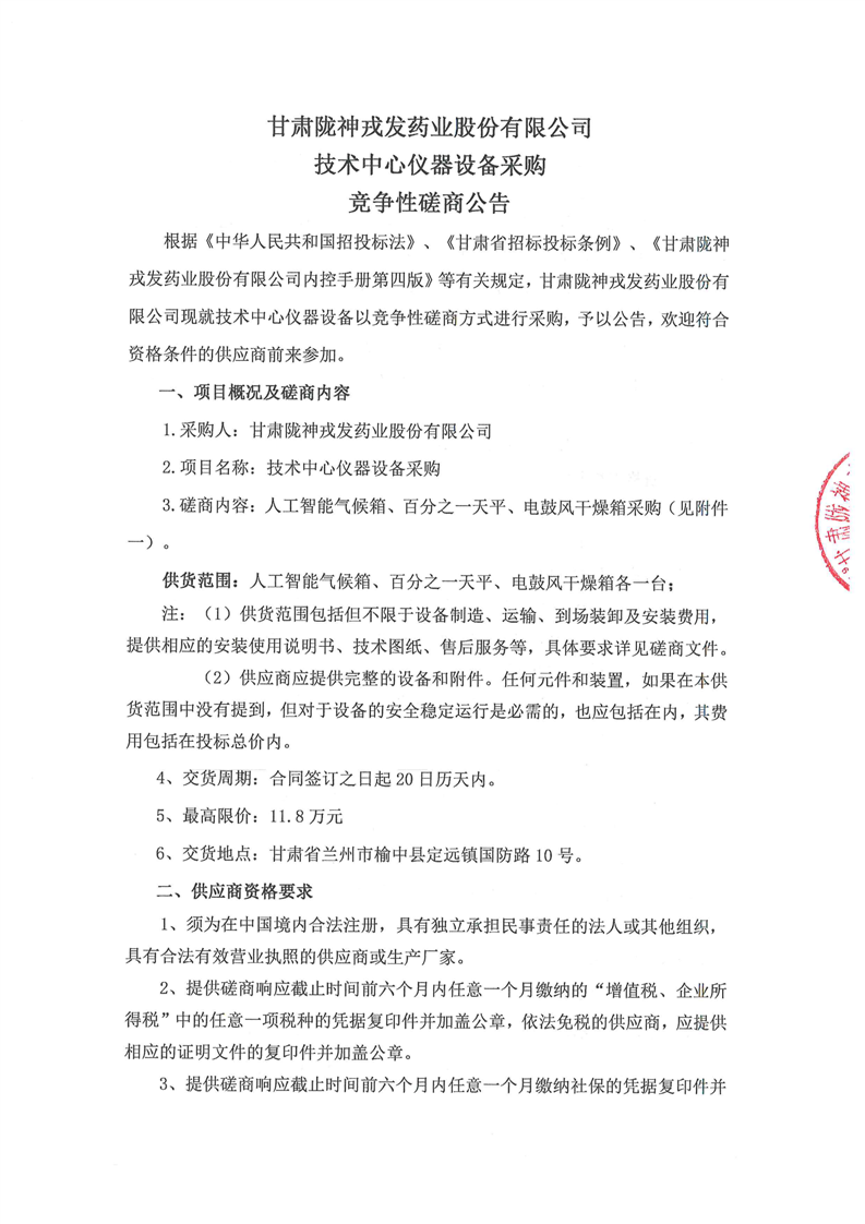 甘肃必一运动药业股份有限公司技术中心仪器设备采购竞争性磋商公告