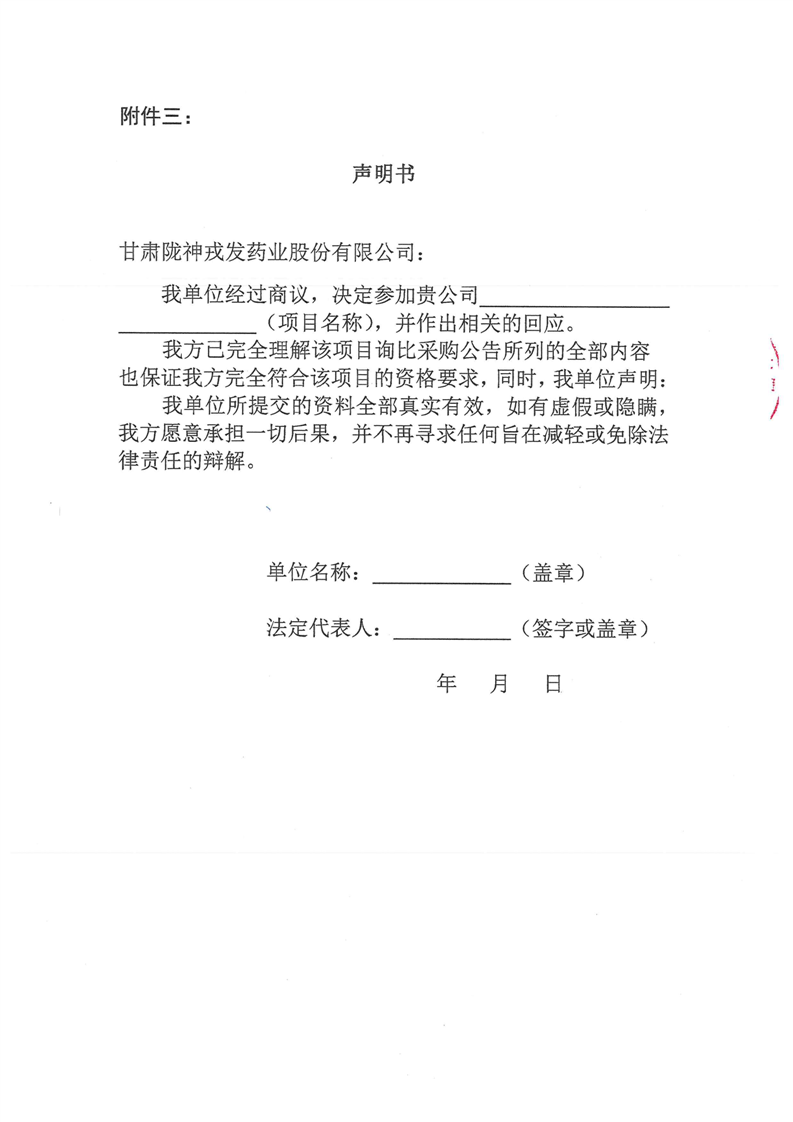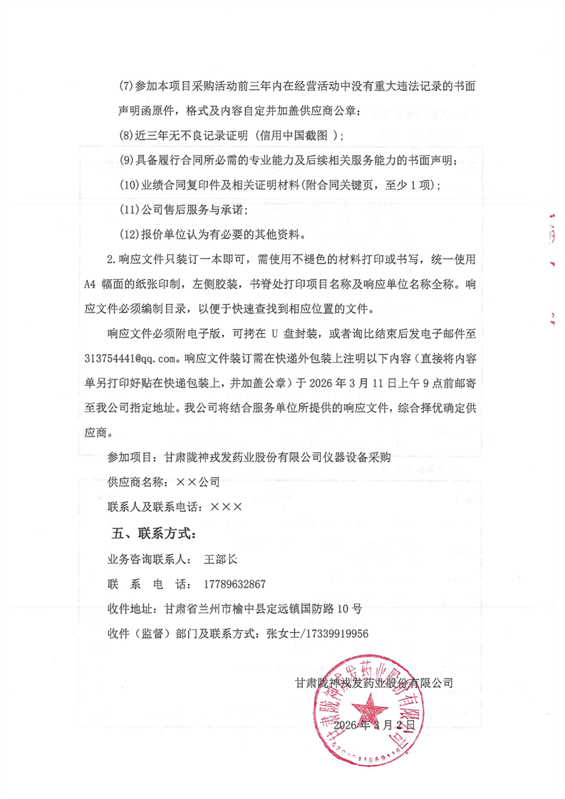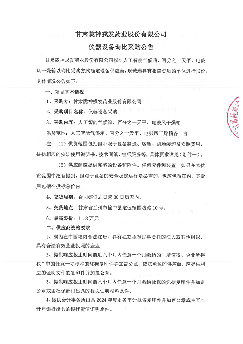 甘肃必一运动药业股份有限公司仪器设备询比采购公告