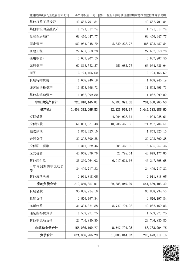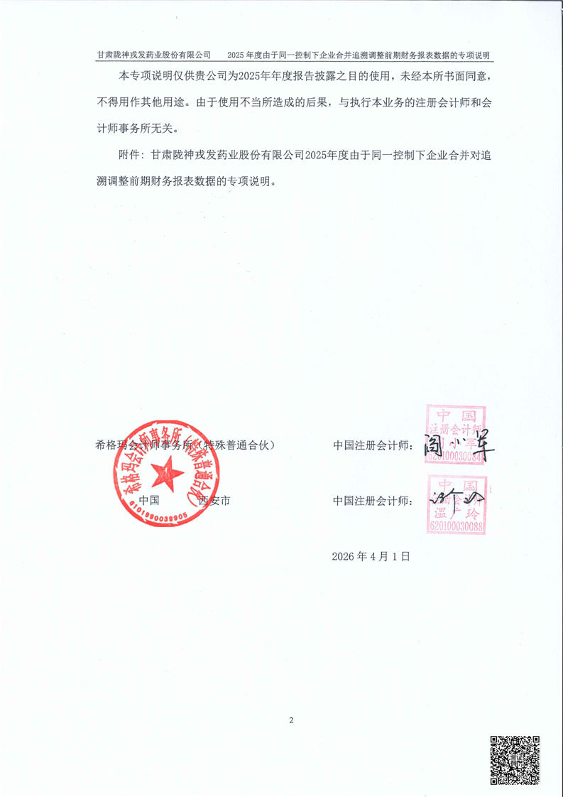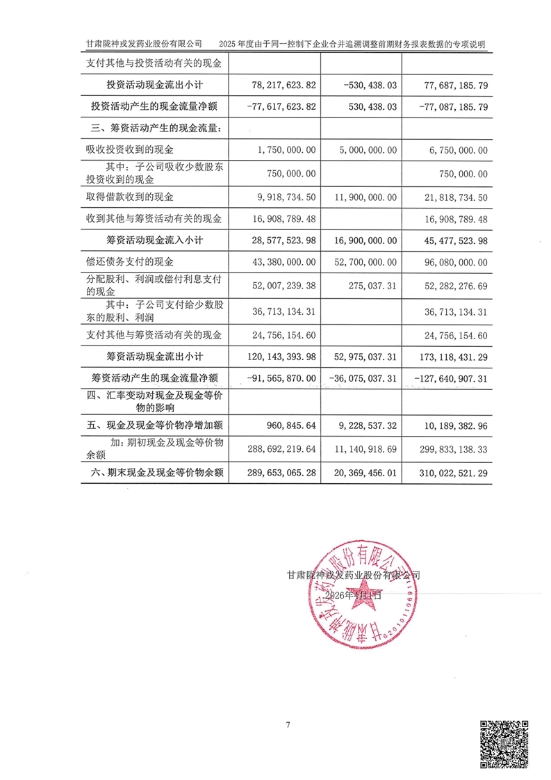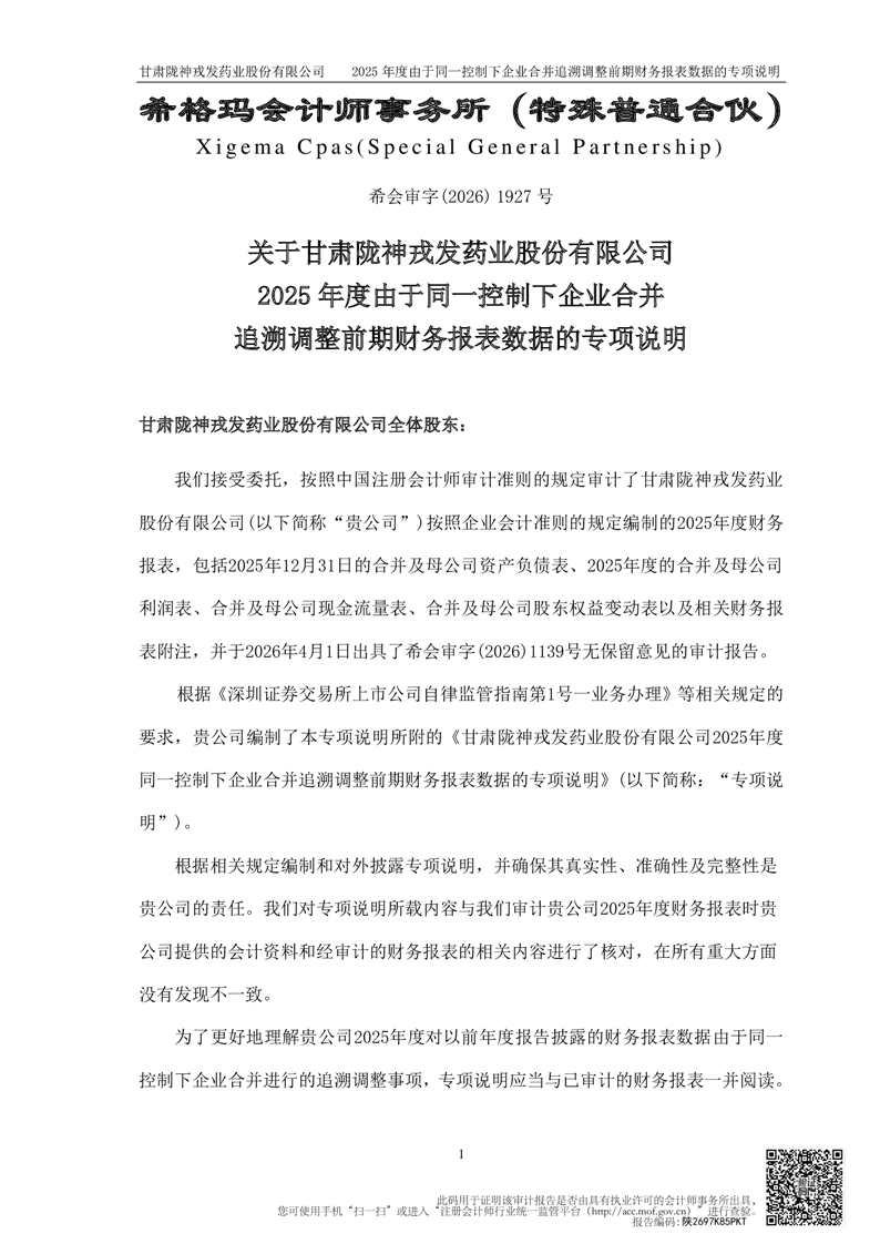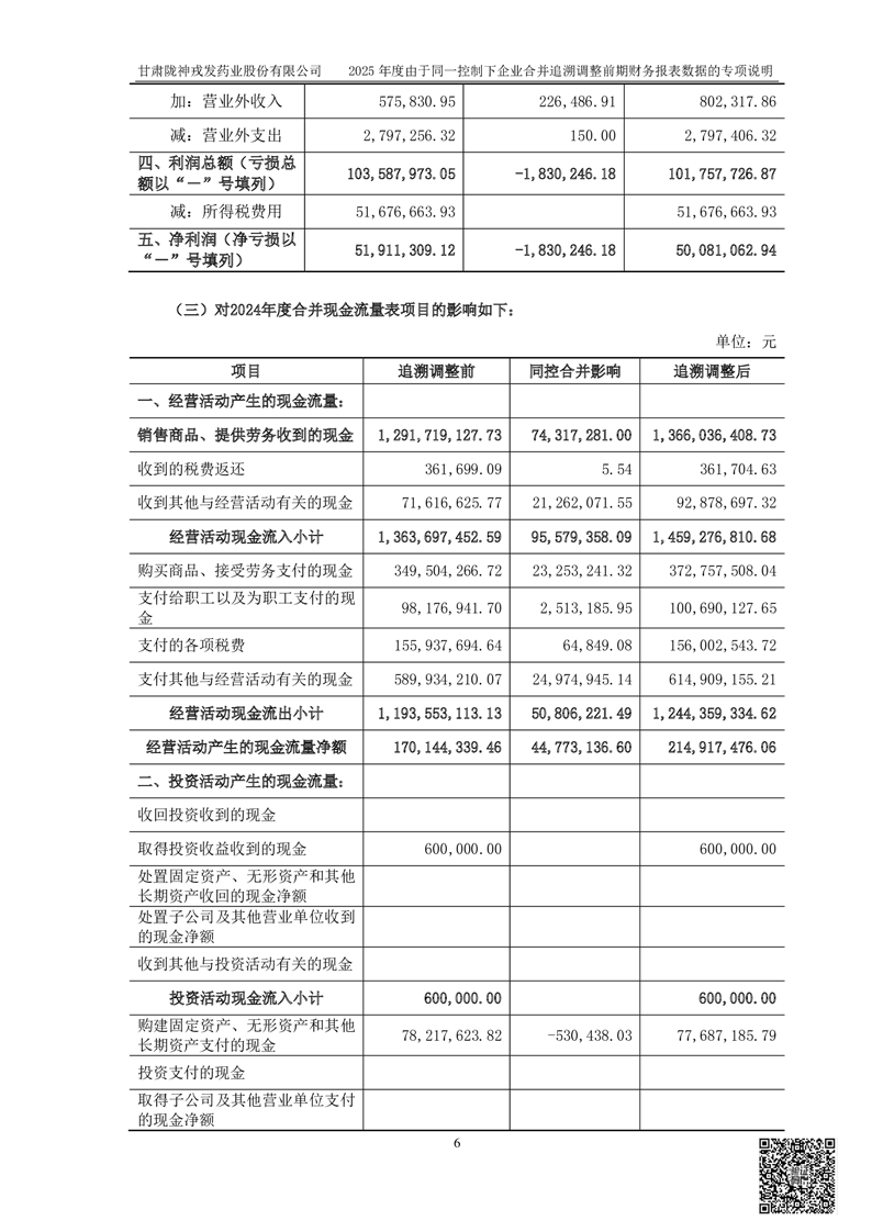 关于甘肃必一运动药业股份有限公司2025年度由于同一控制下企业合并追溯调整前期财务报表数据的专项说明