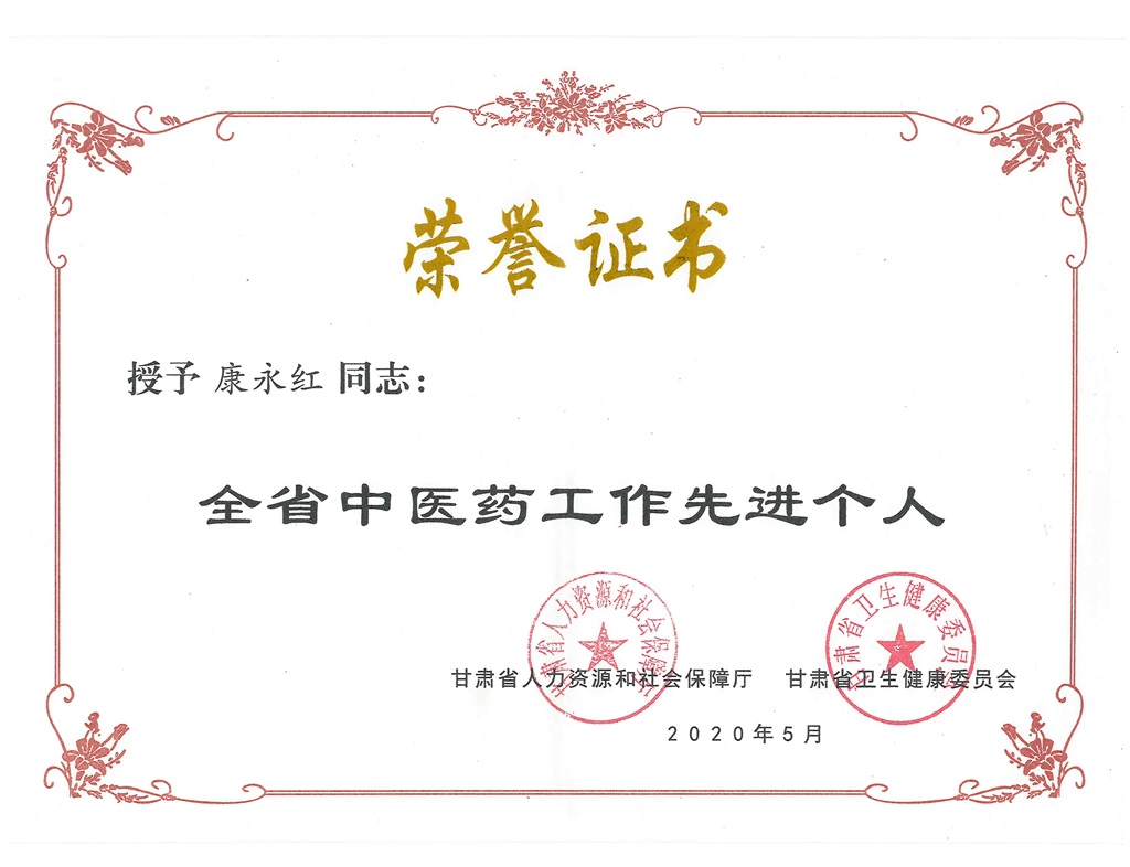 必一运动康永红同志荣获“全省中医药工作先进个人”