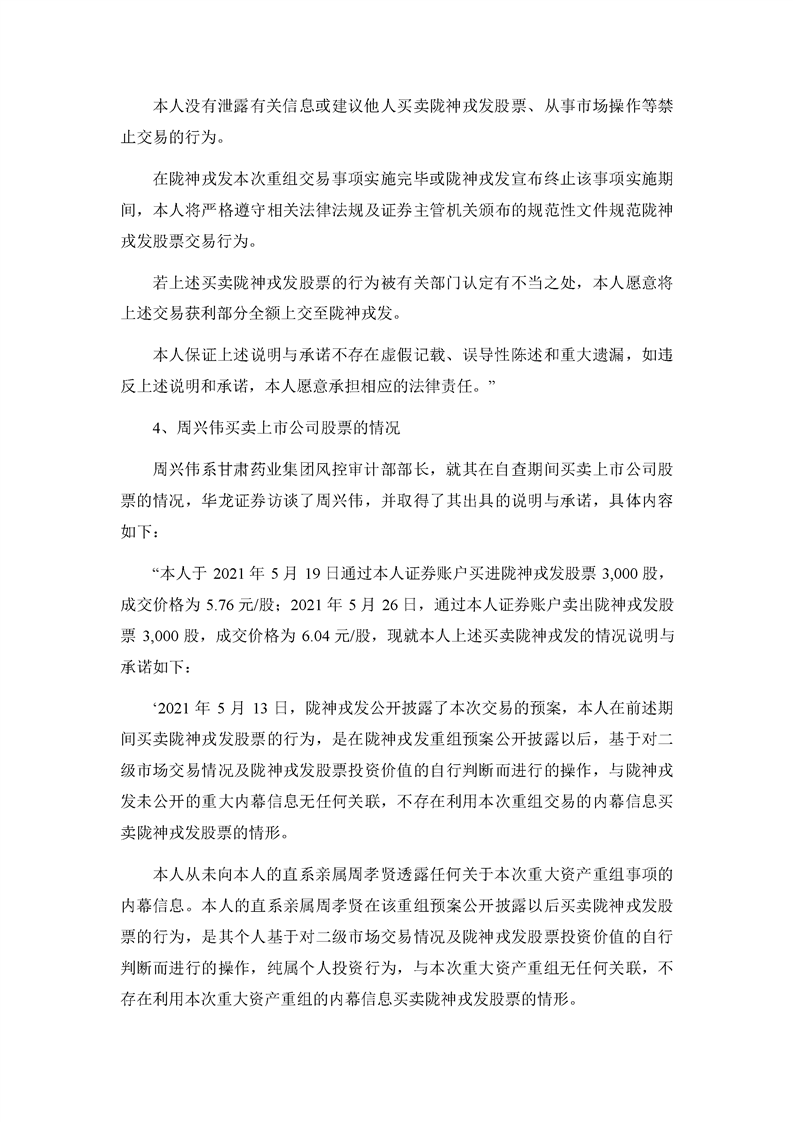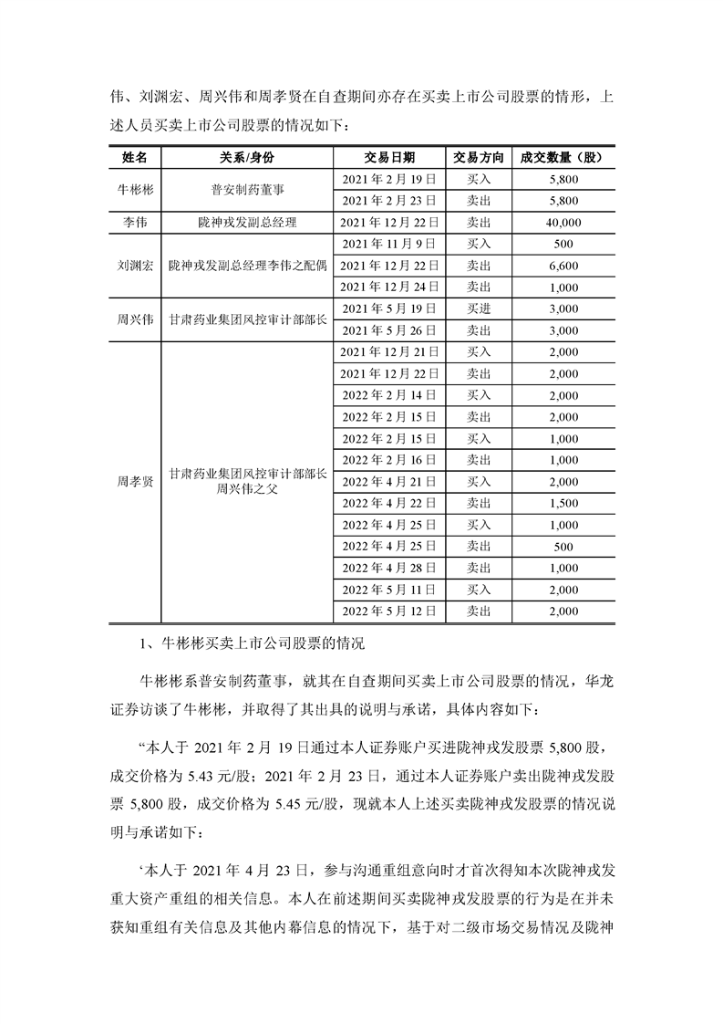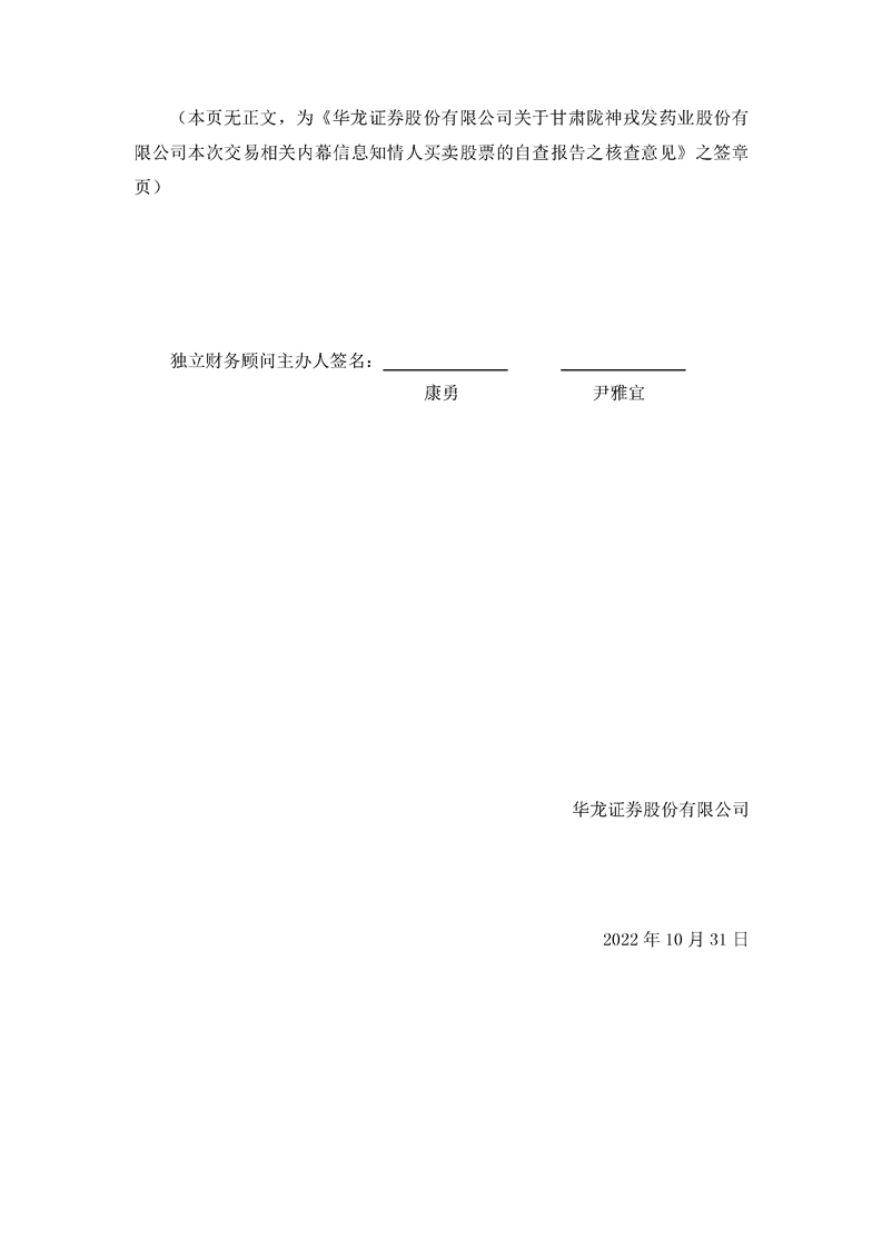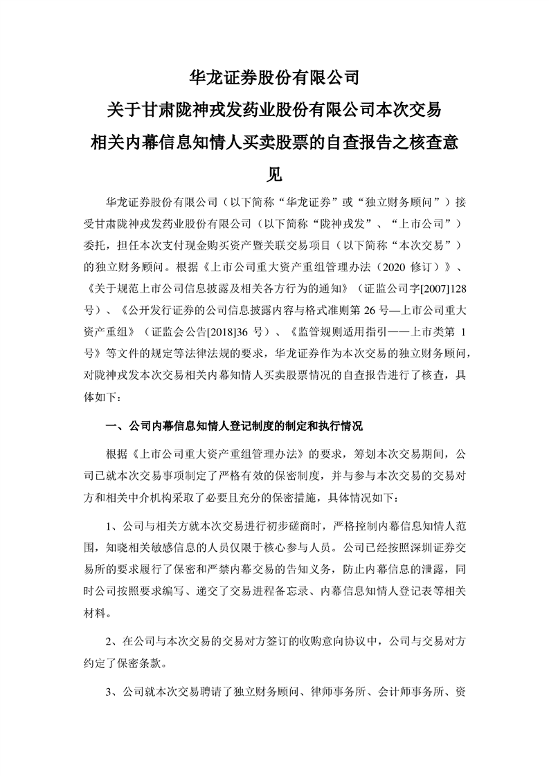华龙证券股份有限公司关于甘肃必一运动药业股份有限公司本次交易相关内幕信息知情人买卖股票的自查报告之核查意见