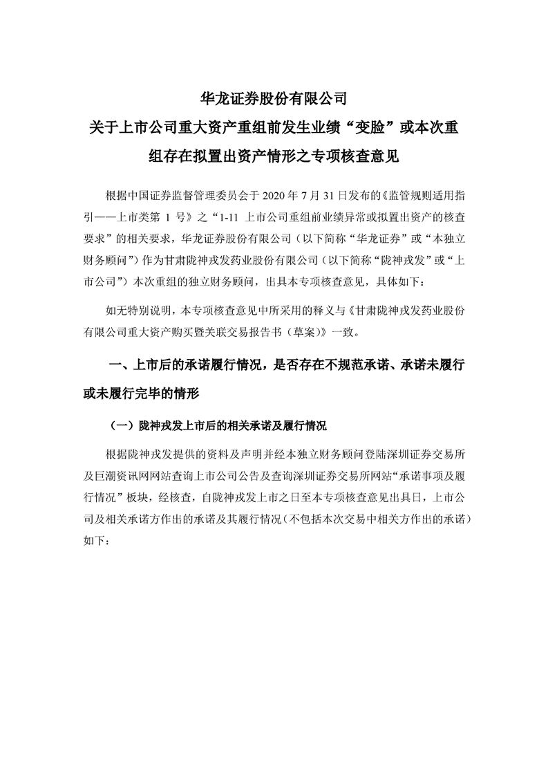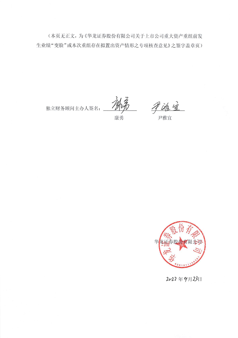 华龙证券股份有限公司关于上市公司重大资产重组前发生业绩变脸或本次重组存在拟置出资产情形之专项核查意见
